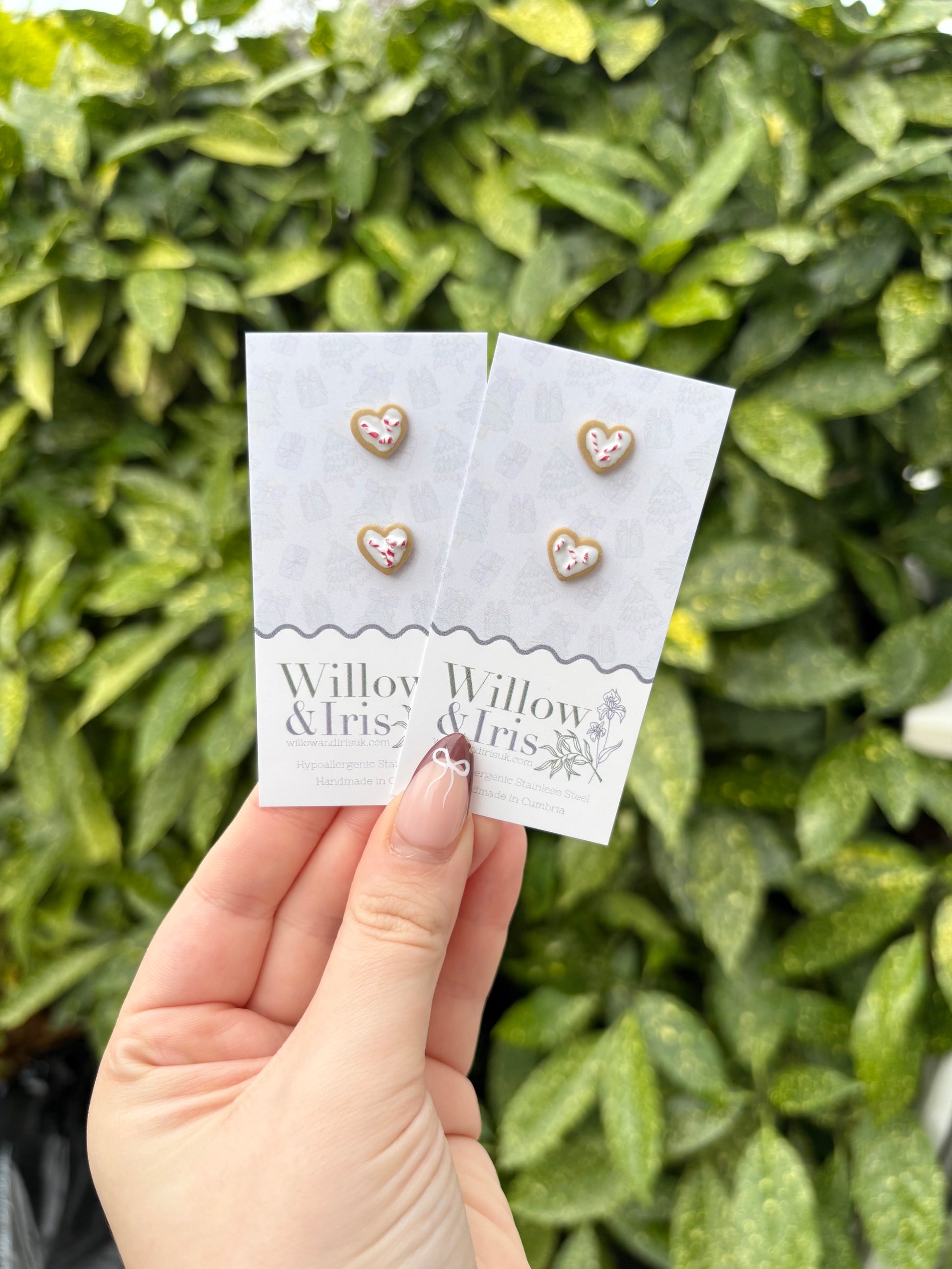 Handmade polymer clay gingerbread heart shape stud earring with a hypoallergenic stainless steel stud post.