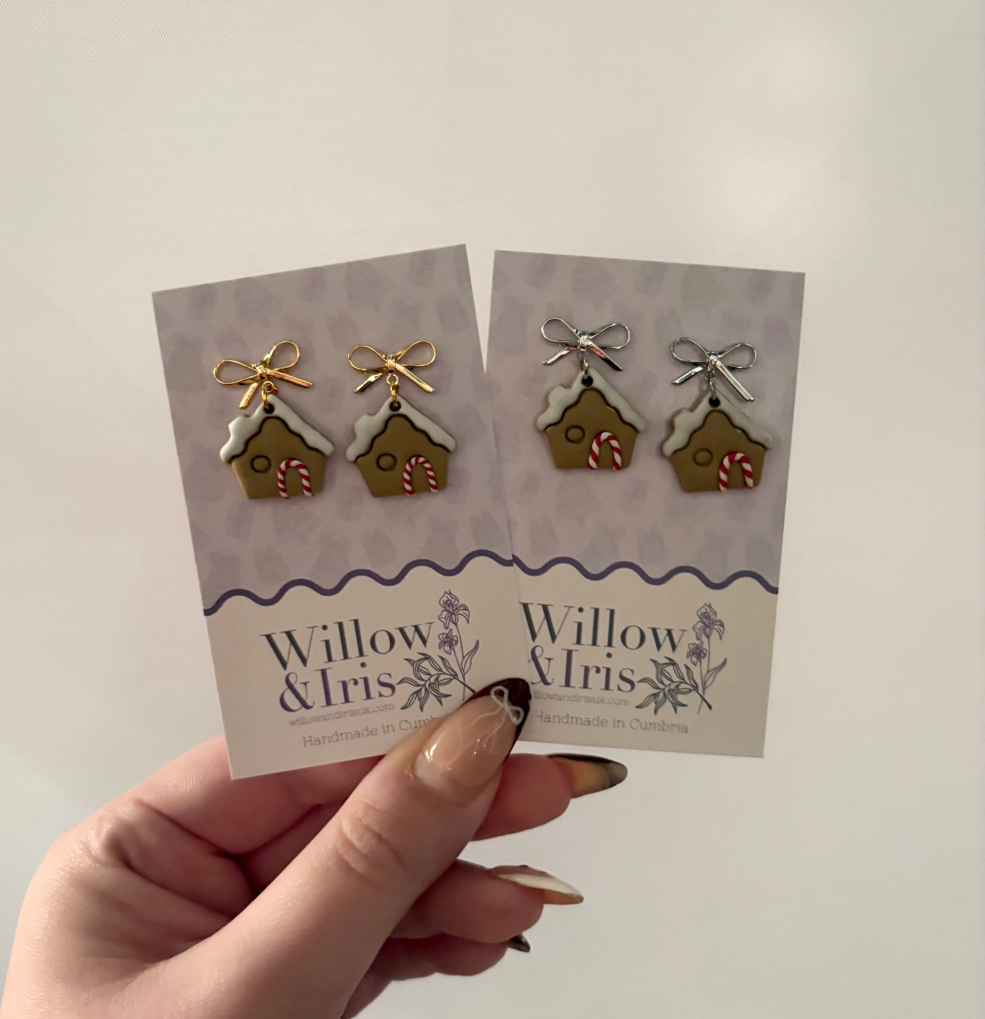 Handmade polymer clay gingerbread house dangle with a choice of gold plated or silver plated stud post